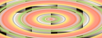 It's also possible to insert transparent areas within the gradient, so that when it is applied over an image or pattern, parts of the image show through the gradient. Choose the transparent area all the way down to the bottom of the color picker, and make sure you have the bracket set on the top of the color bar to limit the transparent area to the spot you want it on the gradient. Here's an example of a gradient with a transparent area in it, used as a Elliptical Sunburst over a black and white basket weave pattern.