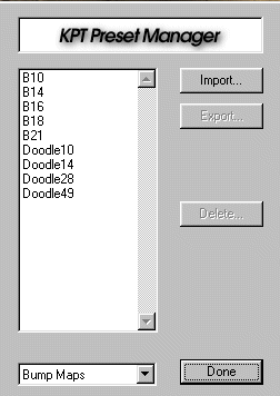 #10 adds one of the 26 built-in bump map textures. You can go to the Bump Map Manager from that menu, which is the dialog box to the right. You can import .bmps for custom textures by selecting the import button and browsing to the image on your harddrive. Make sure the .bmp you are importing has a different name than one of the built-in .bmp's, otherwise it will be overwritten by the new one!