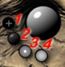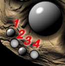 Lamps are turned on and off by clicking directly on them. On the image to the right, button #1 controls the light polarity of that lamp. A positive polarity ("+") results in light being shown onto the sphere from the lamp. Negative polarity means that the light is actually sucked OUT of the sphere towards that lamp. Button #2 controls the Light Intensity, from 0 to 200%. Button #3 affects the intensity of the Highlight, from 0 to 100%. Button #4 controls the color of the light, click on that button to call up the Color Picker. The image to the right shows a sphere being constructed with all lamps on, negative polarity on the second lamp.