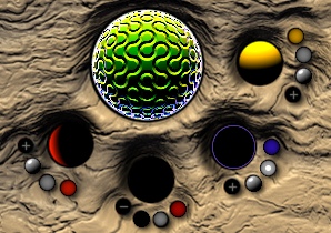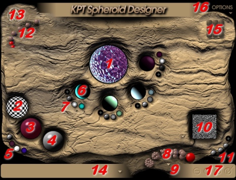 with more marked variation. Clicking on the Kai's icon, #13 will show your sphere in a full screen preview. Click on the preview to return to the KPT3 interface. The series of nine dots, #15, are the Memory Dots. Similar to Presets, the Memory Dots allow you to store mutations of your sphere. A dark brown dot is an empty dot, amber is a full dot, and red is the current memory dot being applied. Store different mutations of your sphere, and then click on the memory dot to recall that version!
